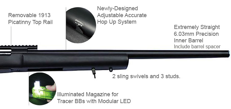 The Modify Airsoft Sniper Rifle MOD24 USR150 is built for shot-to-shot consistency and reliability of accuracy. The MOD24 improves all-round an airsoft sniper's skills, by offering upgraded flexibility and hit rate with the newly-designed, adjustable, accurate Hop Up. Specially-made barrel spacer, accurate trajectory. A wider, adjustable, textured trigger; a removable Picatinny top rail for mounting sights; 2 sling swivels and 3 studs; adjustable Butt Stock; a steel cylinder and strengthened metallic internal parts. Its field credentials is complemented with non-glare, non-reflective finish for better camouflage. Every Modify MOD24 USR150 has gone through Airtightness tests.